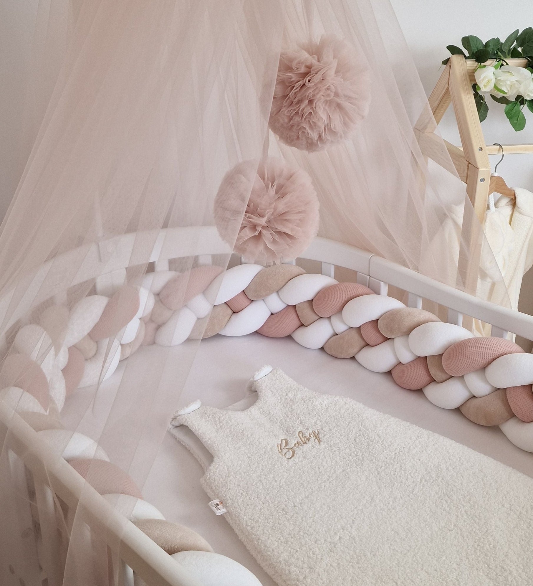 Entièrement personnalisable, la tresse de lit est confectionnée à la main avec des matières douces et moelleuses, elle assure à la fois confort et sécurité dans le lit de votre enfant tout en apportant une touche décorative unique.