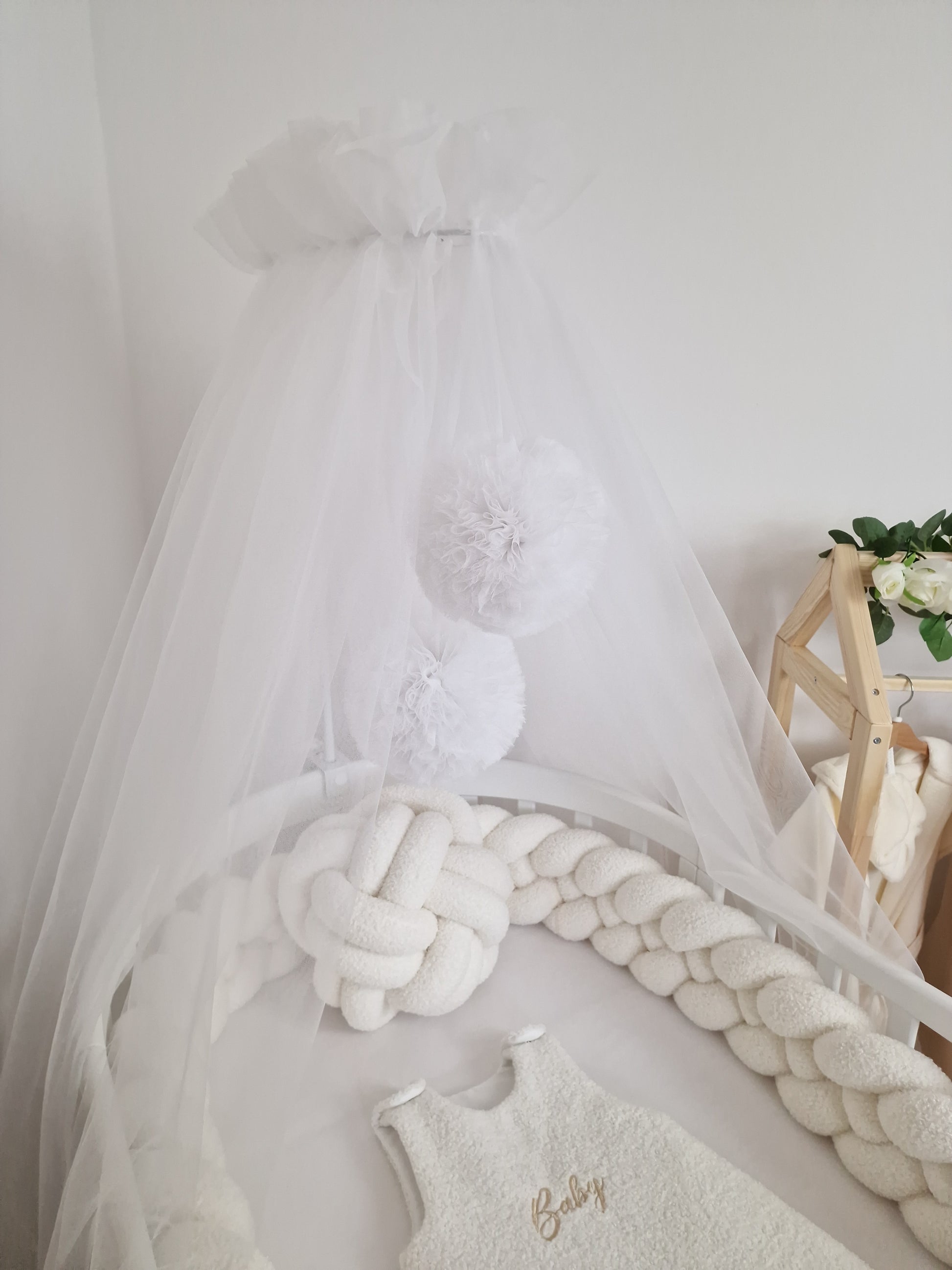 Ce ciel de lit se distingue par son élégance et son côté onirique. Réalisé en tulle léger, ce ciel de lit crée une atmosphère douce et aérienne. Le tulle transparent est subtilement plissé pour entourer le lit avec grâce et ajouter un effet de légèreté. Le détail qui capte l'attention est un gros pompon moelleux qui pend délicatement au centre ou sur le côté, ajoutant une touche de douceur et de fantaisie. Ce pompon, souvent assorti aux nuances pastel ou neutres du ciel de lit, est fait avec soin, invitant à la rêverie et apportant une ambiance cocooning parfaite pour une chambre d’enfant.