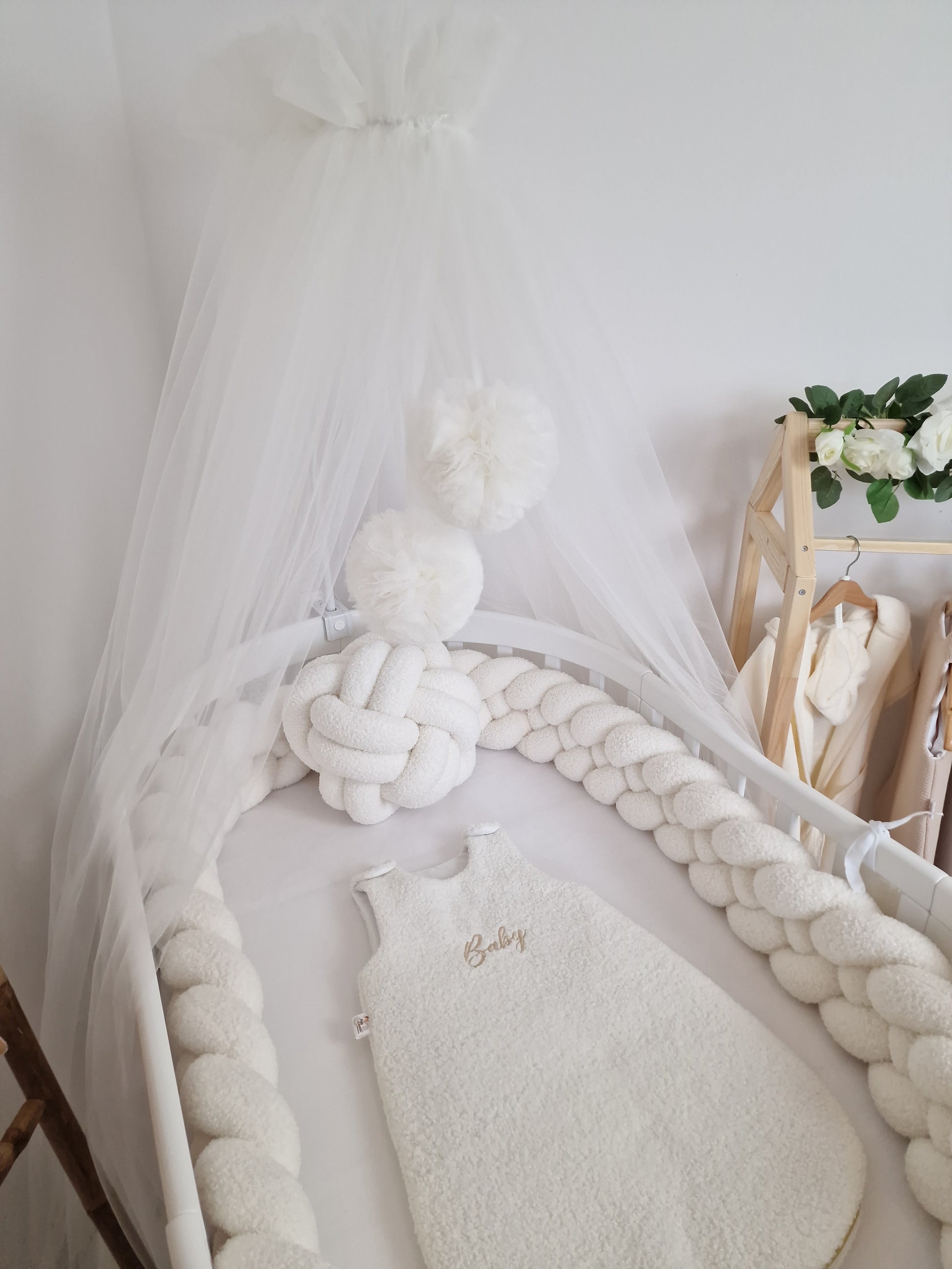 Ce ciel de lit se distingue par son élégance et son côté onirique. Réalisé en tulle léger, ce ciel de lit crée une atmosphère douce et aérienne. Le tulle transparent est subtilement plissé pour entourer le lit avec grâce et ajouter un effet de légèreté. Le détail qui capte l'attention est un gros pompon moelleux qui pend délicatement au centre ou sur le côté, ajoutant une touche de douceur et de fantaisie. Ce pompon, souvent assorti aux nuances pastel ou neutres du ciel de lit, est fait avec soin, invitant à la rêverie et apportant une ambiance cocooning parfaite pour une chambre d’enfant.