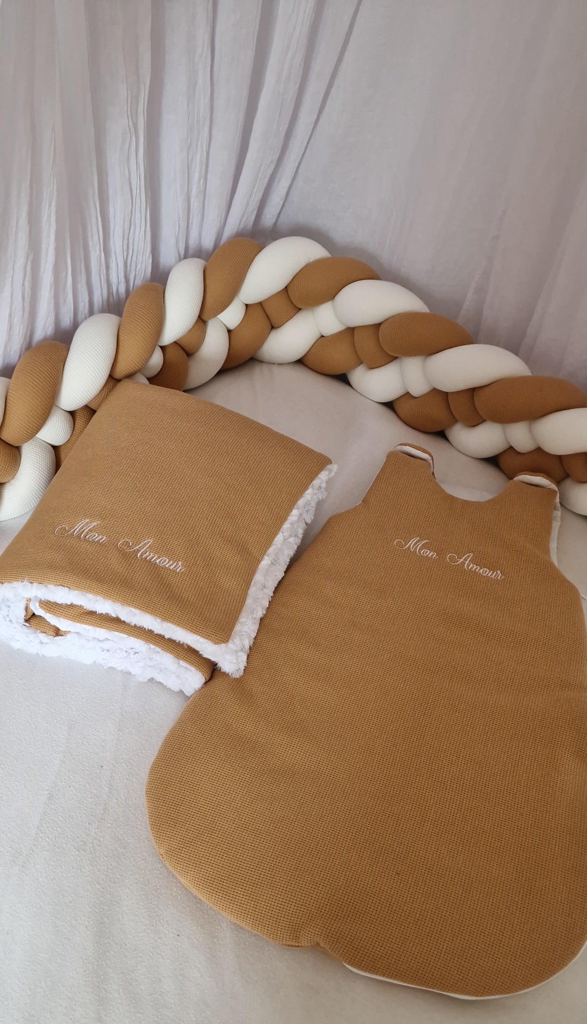 Cet ensemble d’articles personnalisés "Mon Amour" est conçu pour créer un cocon de tendresse autour de bébé. Composé d'une tresse de lit, d'une couverture et d'une gigoteuse, chaque pièce apporte douceur, confort et sécurité.